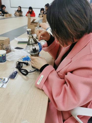活动现场,五彩斑斓的马赛克片、晶莹剔透的装饰珠与金色灯座整齐陈列,宛如一场视觉盛宴。在专业老师的指导下,女教职工们化身“手工匠人”,精心挑选材料、设计图案,将不同颜色的马赛克碎片与珠饰拼贴在灯座上。一盏盏流光溢彩的阿拉丁神灯在巧手中诞生,传递着节日的喜悦。